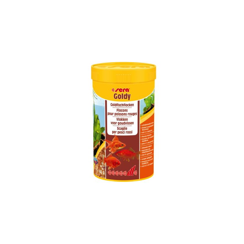 SERA goldy contiene espirulina y harina de gérmenes de trigo y por ello es idóneo para los peces de agua fría en acuarios y estanques de jardín.